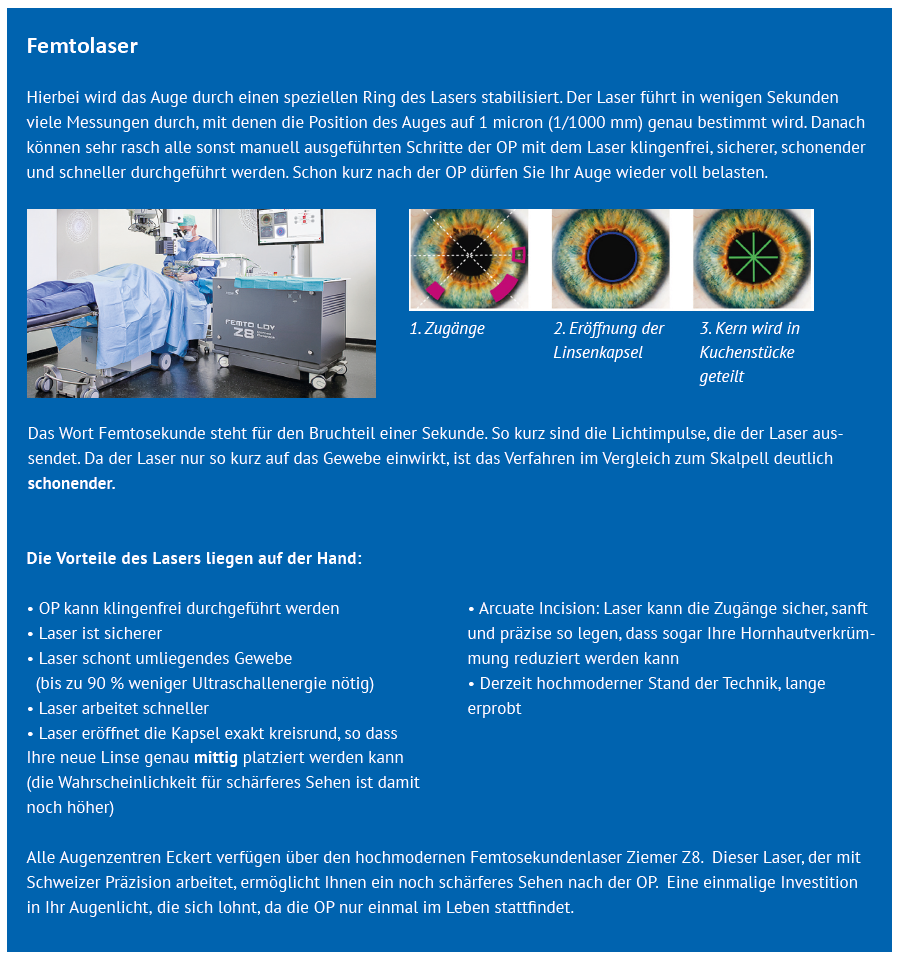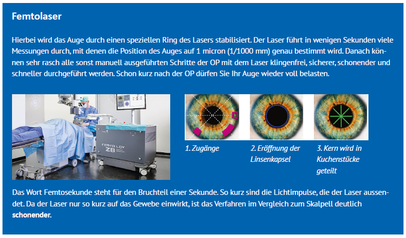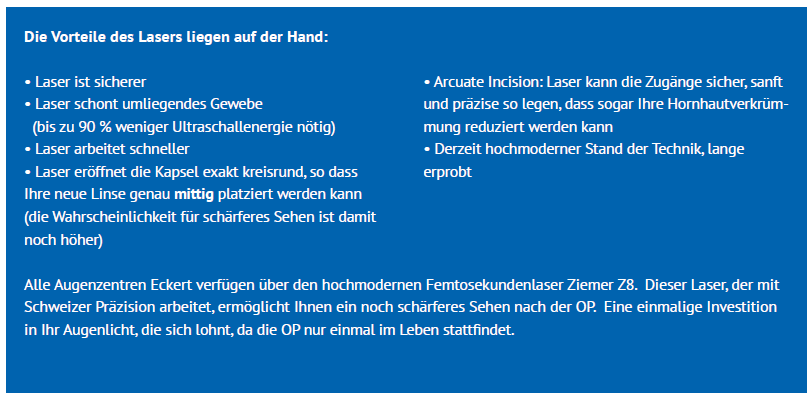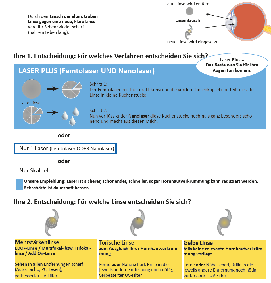 Bei allen Linsentypen wird in einer kurzen OP die körpereigene Linse entfernt und eine Kunstlinse in das Auge eingesetzt. Dies ist der gleiche Eingriff, der durchgeführt wird, wenn sich die Linse altersbedingt durch den grauen Star eintrübt. Es ist sowohl eine örtliche Betäubung als auch eine Kurznarkose möglich. Die OP kann mit Laser Plus durchgeführt werden. Hierbei eröffnet der erste Laser (Femtolaser) die vordere Linsenkapsel und macht aus der alten Linse Kuchenstücke. Der zweite Laser (Nanolaser) macht aus den Kuchenstücken milchartige Flüssigkeit und saugt diese besonders schonend ab. Auf Wunsch kann die OP auch nur mit einem Laser oder ganz ohne Laser durchgeführt werden. Selbstverständlich ist die OP mit beiden Lasern die schonendste Methode für Ihr Auge.