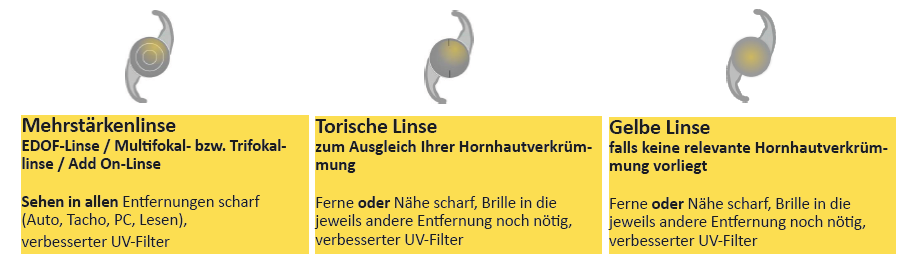 Alternativ gibt es auch noch die gelbe oder torische Linse (Monofokallinse), die je nach Eigenschaft Ihres Auges (z. B. bei Hornhautverkrümmung) zur Anwendung kommt.